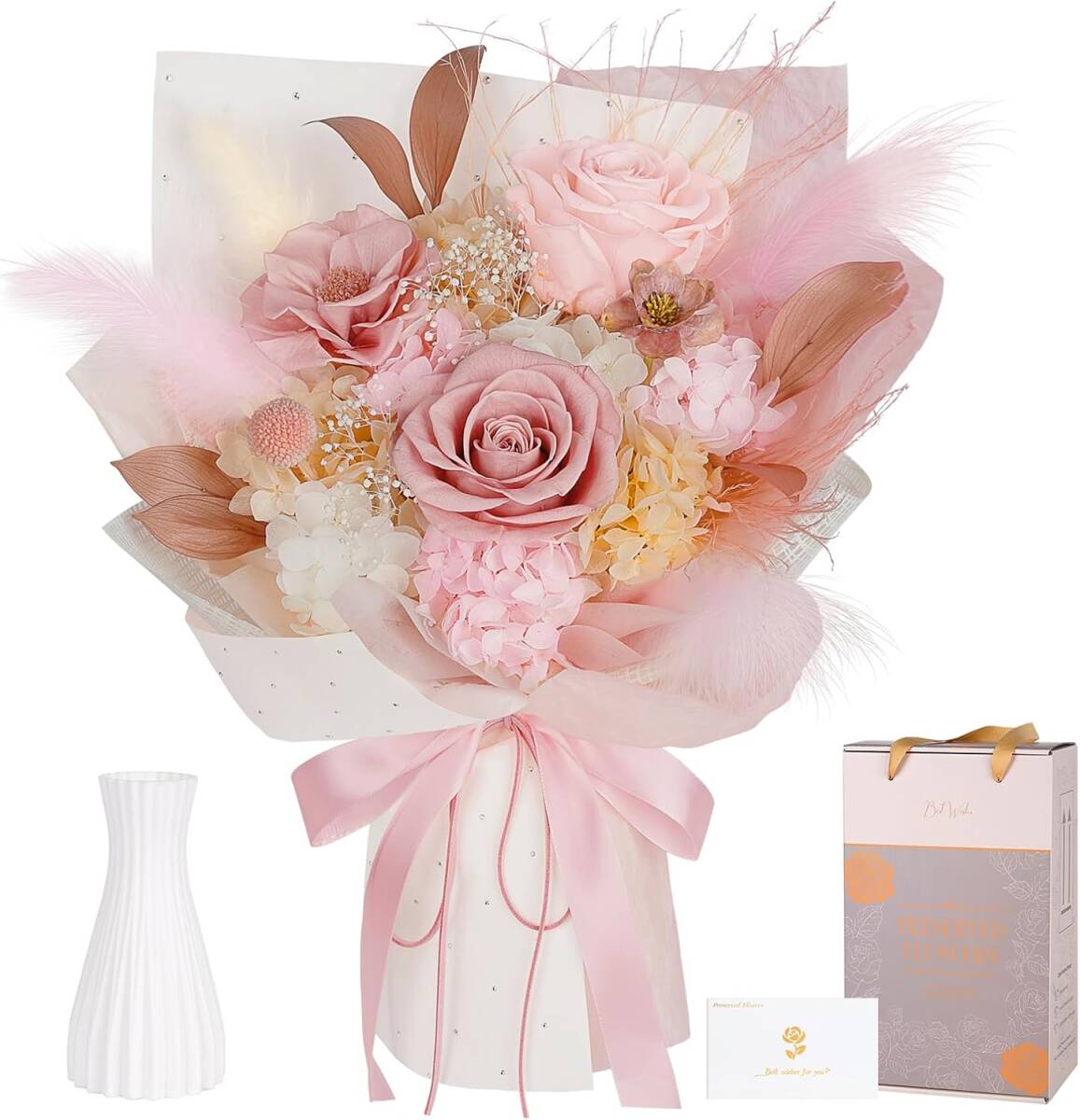 - プリザーブドフラワー ピンク 花束 花瓶付き 薔薇 つばき アジサイ 枯れない花 ブーケ
