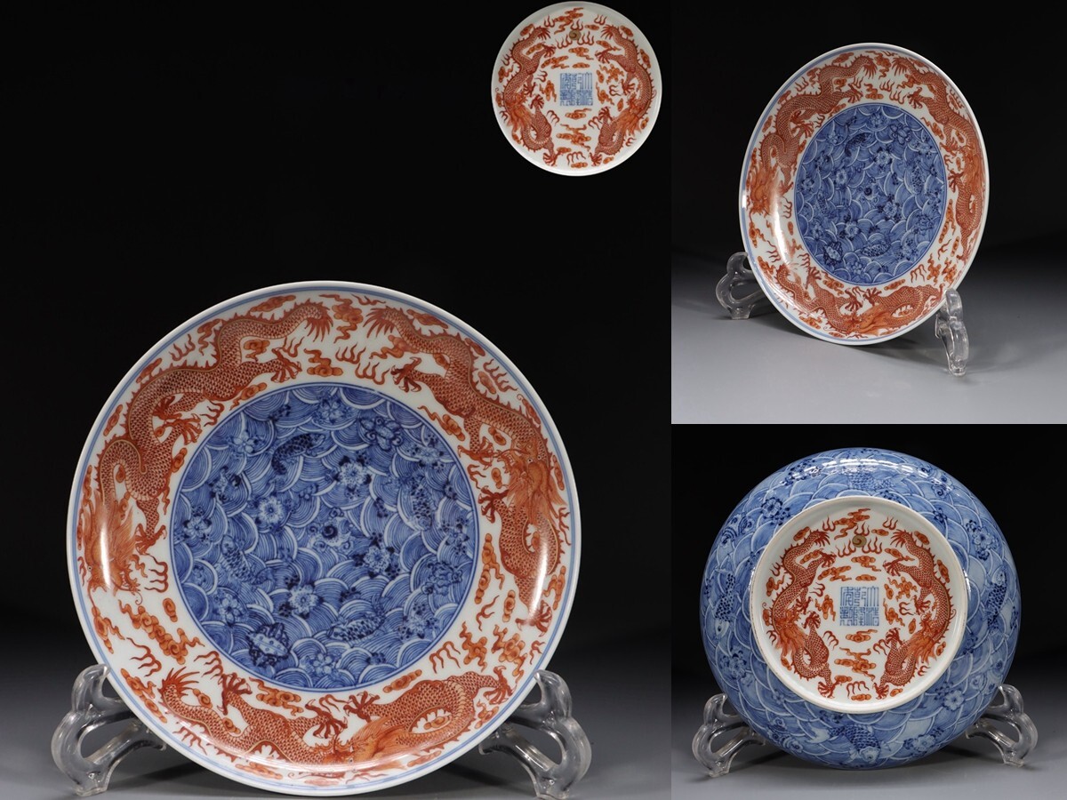 - 「清 乾隆年製 陶磁器 青花礬紅海水龍紋 賞盤」染付 置物 擺件 古賞物 中国古美術 旧蔵出