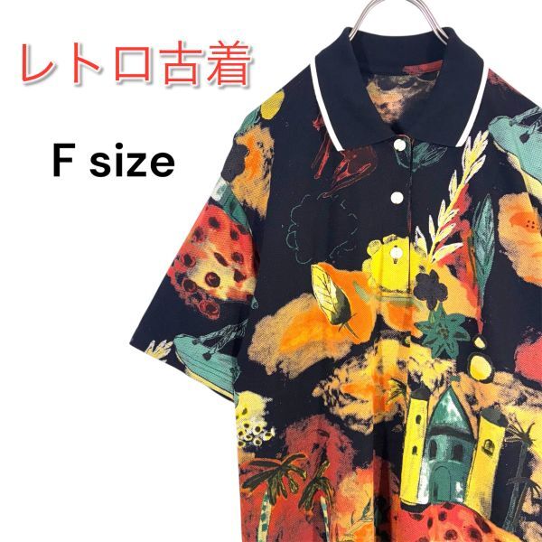 - レトロ 半袖ポロシャツ 総柄 アート BOB SPORTS レディース サイズF