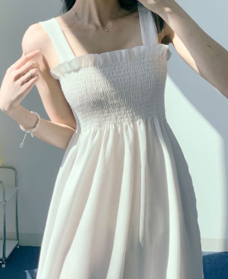 - 匿/ゆうパケット送込【未使用・タグあり/シャーリングワンピース】 アイボリー・白・ ホワイト ポリ100% 夏服