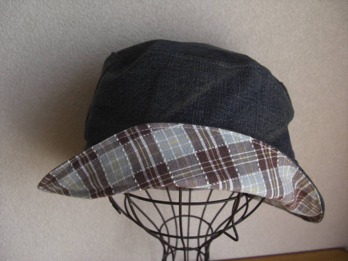- ★ハンドメイド バケット帽 リメイク リバーシブル 紺ジーンズ&茶や水色チェック