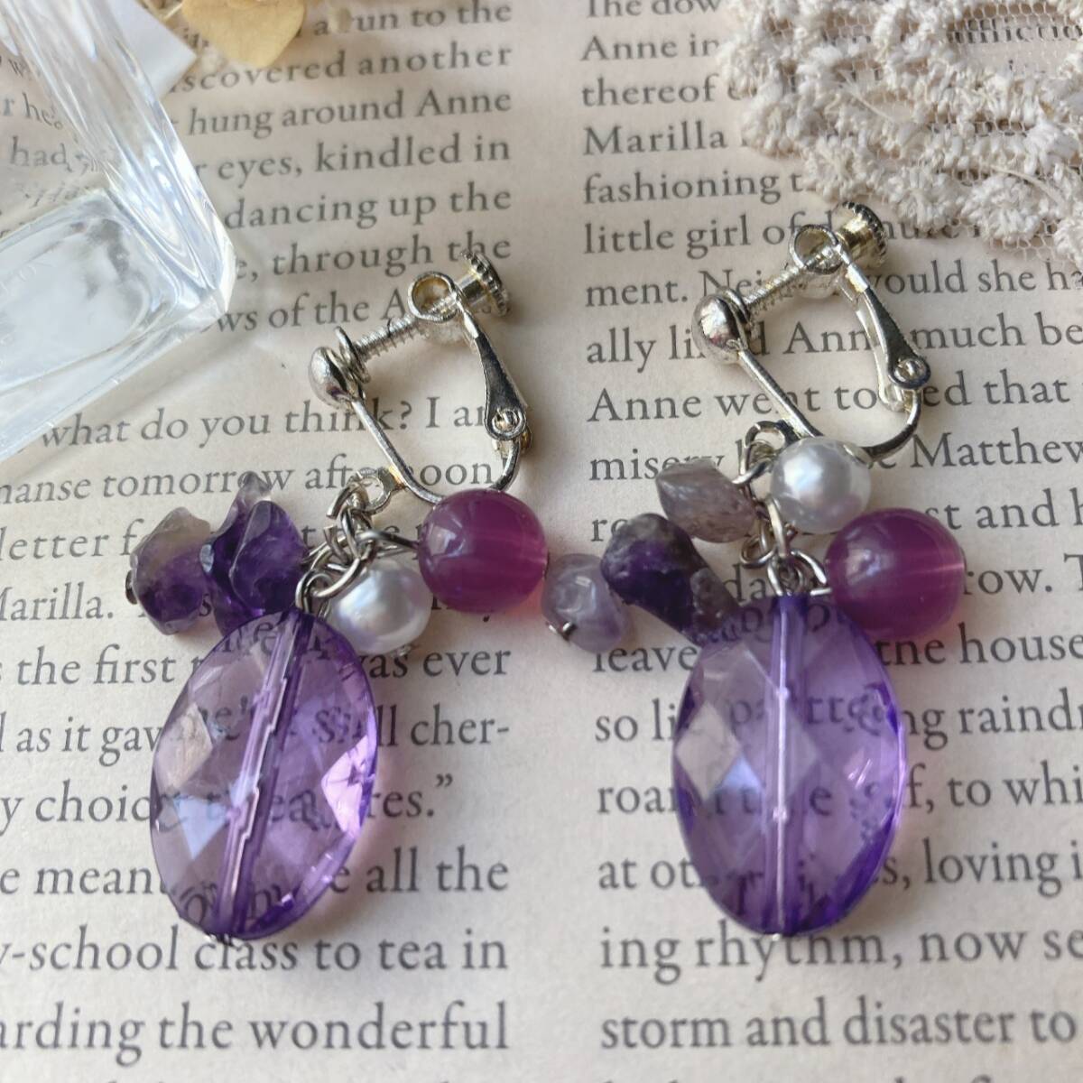 > イヤリング パープル グレープ 大粒ビーズ ストーン さざれ石 シルバー パール ゆらゆら☆vintage jewelry accessories R0855