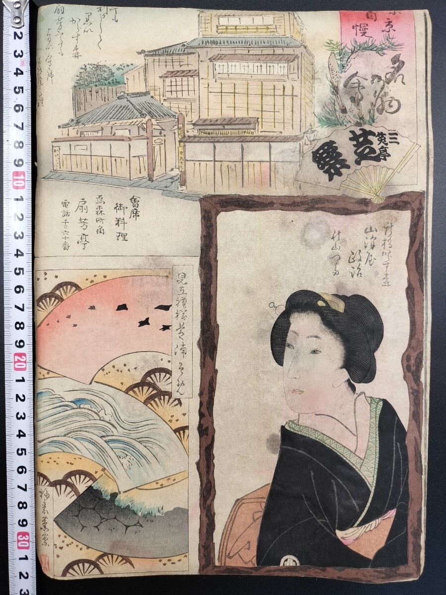 - 明治期/真作 梅素薫案「東京自慢名物会」本物浮世絵木版画 貼交絵 錦絵 大判 裏打ち