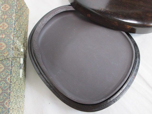 - 雉坂★書道用品【 端渓抗仔楕円彫刻入硯 =未使用= 唐木ケース・布箱付 】★端渓硯・中国美術・硯・文房具・文房四宝