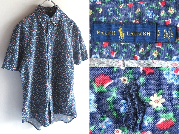 - ネコポス対応 RALPH LAUREN ラルフローレン 花柄 フラワー柄 総柄 コットン 半袖 ボタンダウン BDシャツ S ネイビー 紺 国内正規品