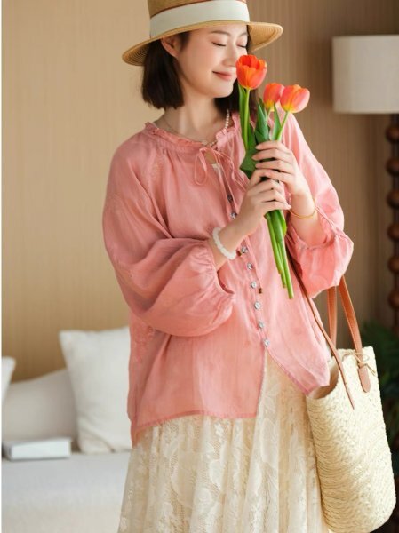 - xe 2507 ワイシャツ フリーサイズ チュニック トップス 大人可愛 ナチュラル ふんわり 麻100% ゆったり 通気性肌触り抜群 豪華刺柄3