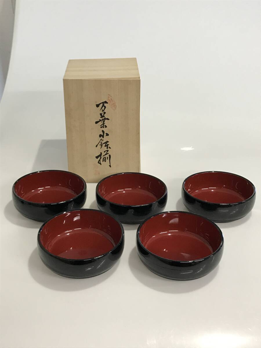 - G8412 うるし塗 万葉小鉢揃 5客 黒 内朱 漆器 漆芸 深さ約5.5cm 伝統工芸 和食器 箱あり