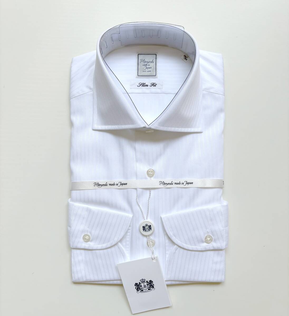 > 新品 HITOYOSHI 38 - 84 ヒトヨシ ワイドカラー 長袖 シャツ ドレスシャツ スリムフィット SLIM FIT ドビーストライプ 白 ホワイト 日本製