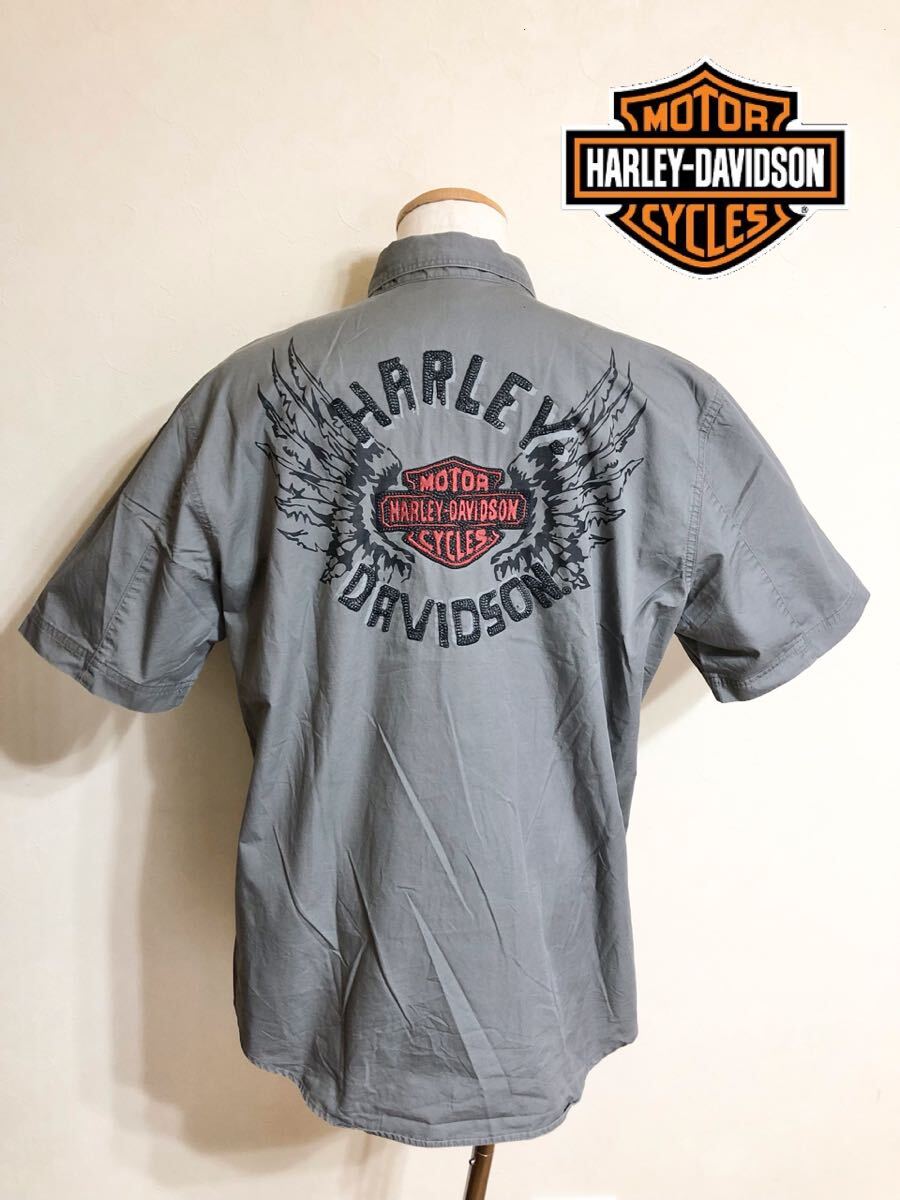 - HARLEY DAVIDSON ハーレーダビッドソン ワークシャツ トップス 刺繍 ビッグロゴ スカル メンズ USサイズL 半袖 グレー 綿
