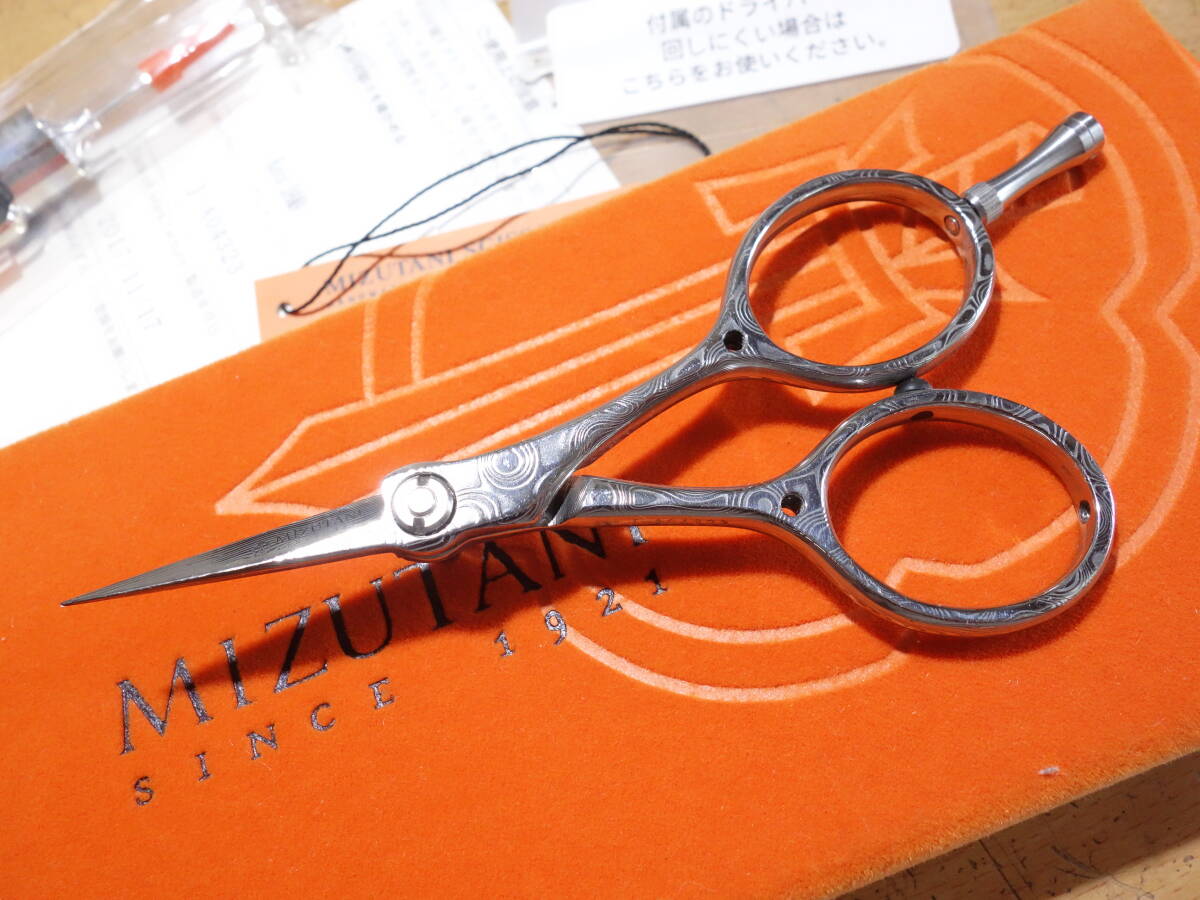 > 【タイイングツール整理】KAVA カヴァ ミズタニ シザーズ 最高級のダマスカス・モデル サイズ標準M 開封のみの新同品 定価14万5200円