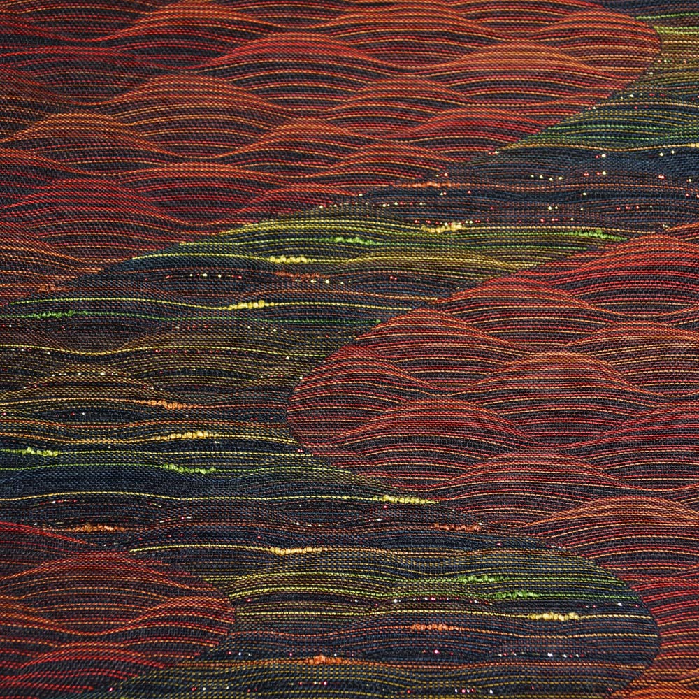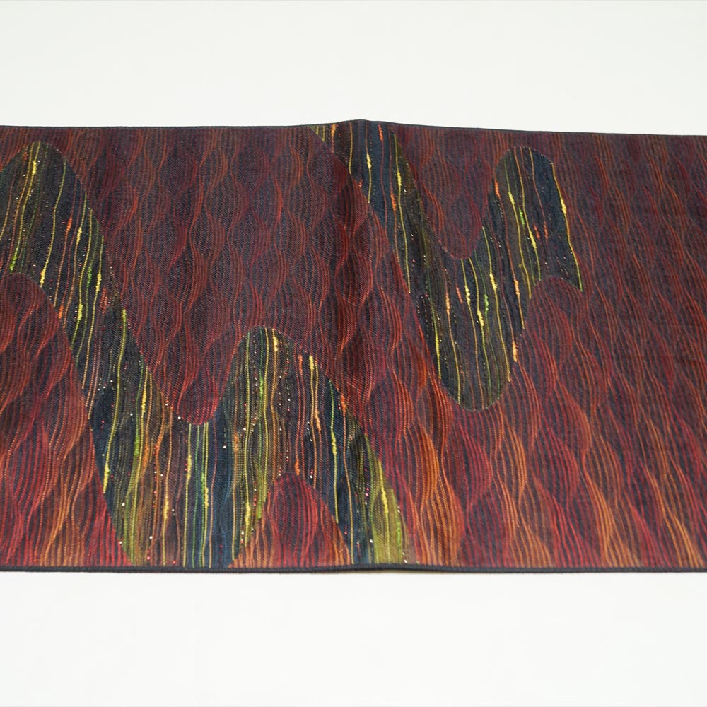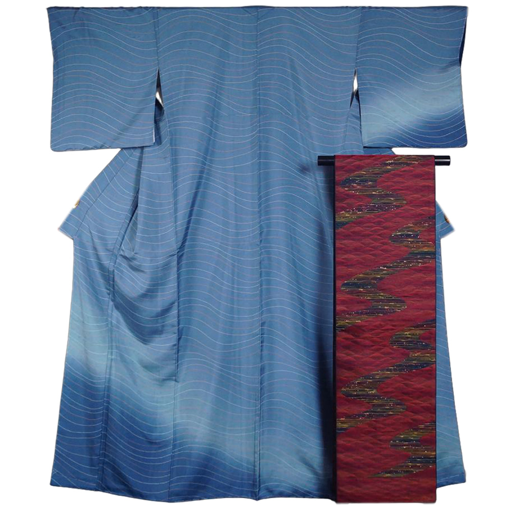 - 着物セット 白山紬 洒落訪問着・洒落袋帯 2点 セット ぼかしに波線模様 青藤色系ぼかし Lサイズ 紬 中古 リサイクル着物 白山 きもの天陽