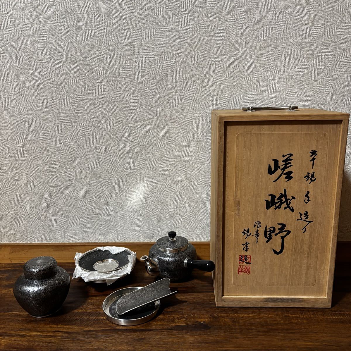 - 希少 未使用 浪華 錫半造 本錫 嵯峨野 茶器一式 棚付 急須 茶托 瓶座 茶入 茶匙 茶壷 茶瓶 木箱 煎茶道具 送料無料