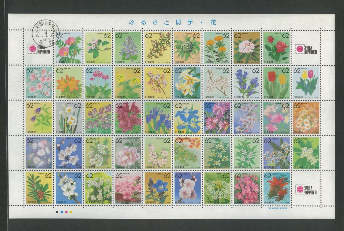 - 日本切手 1990年 ふるさと切手・花(都道府県の花)62円 47枚シート 初日印付