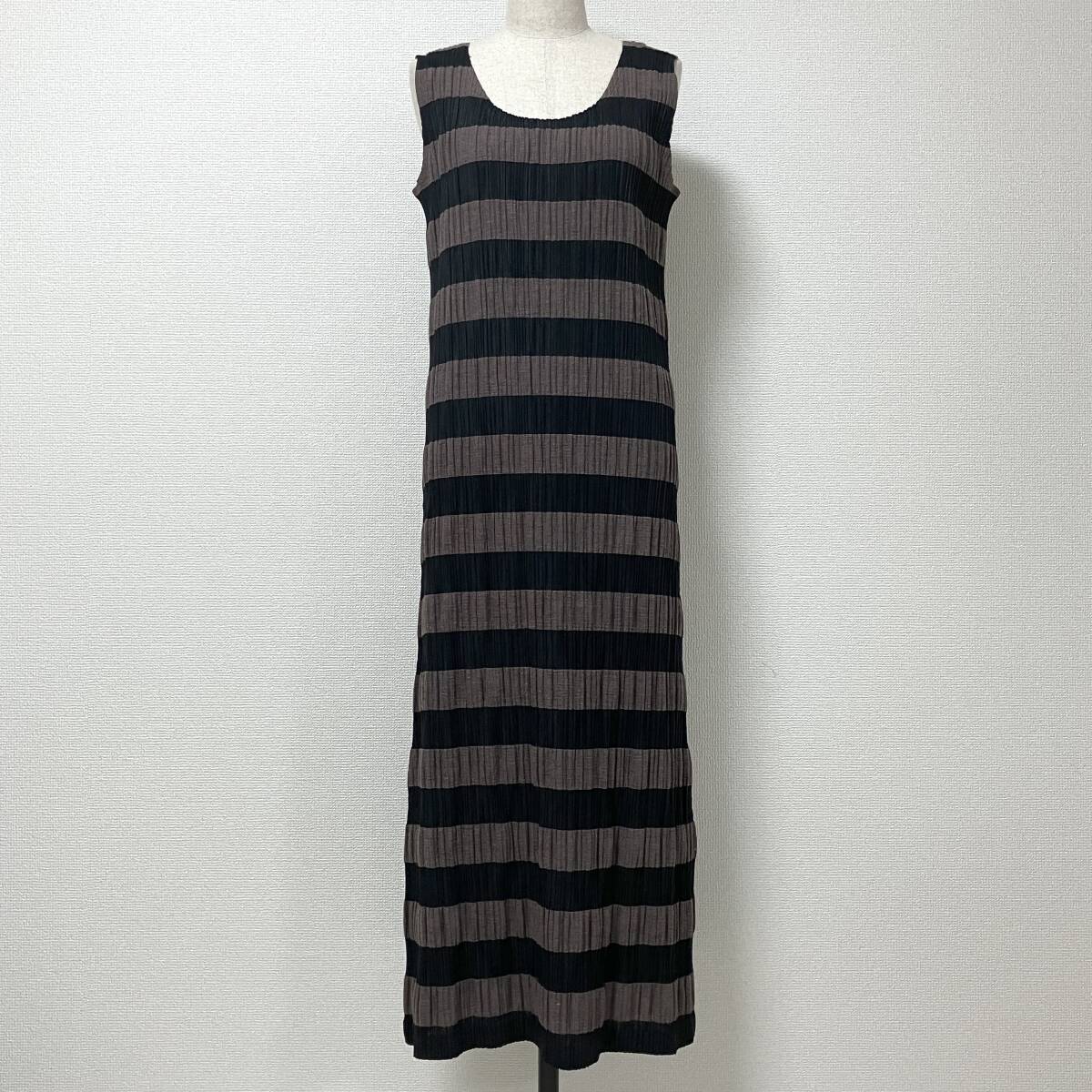 > ISSEY MIYAKE PLEATS PLEASE ボーダー ポリ リネン混 プリーツ ノースリーブ ロング タイト ワンピース イッセイミヤケ 麻 archive 3110276