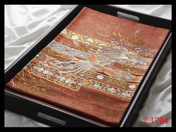 - 蔵【テ1204】西陣逸品 総刺繍 横段唐草花鳥古典紋 赤銅色地 正絹純金糸太鼓柄高級美術袋帯 ◇検◇簪着物名古屋帯和装小物帯締め