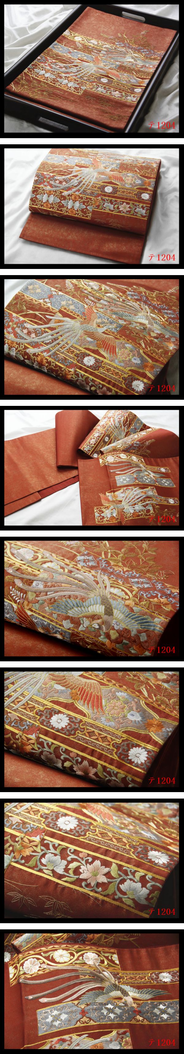 > 蔵【テ1204】西陣逸品 総刺繍 横段唐草花鳥古典紋 赤銅色地 正絹純金糸太鼓柄高級美術袋帯 ◇検◇簪着物名古屋帯和装小物帯締め