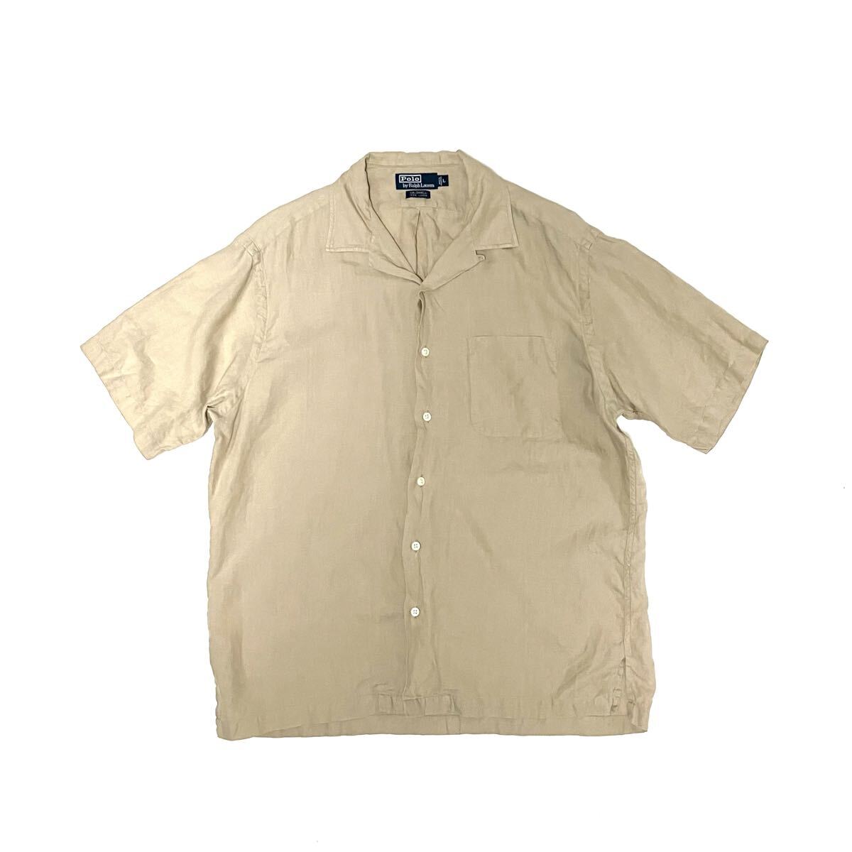 > L ポロ ラルフローレン Caldwell 半袖 シャツ 裾ポニー刺繍無し カーキ 開襟 オープンカラー リネン100% 90’s 90年代 ヴィンテージ POLO