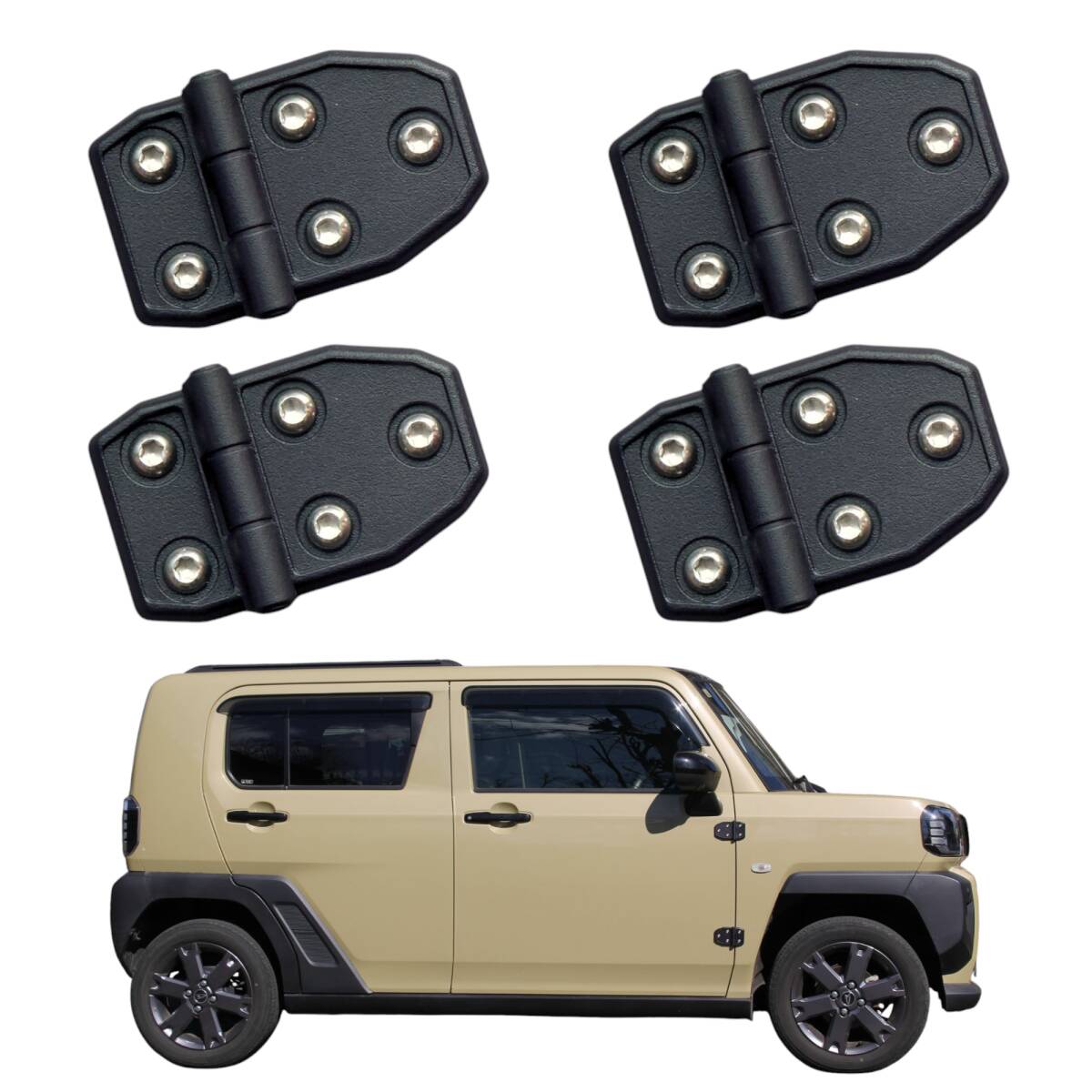 - タフト 用★ダミーヒンジ 4個セット★ステンレスボルト仕様 両面テープ貼付け ドアヒンジ アウターヒンジ ダイハツ カスタム アクセサリー