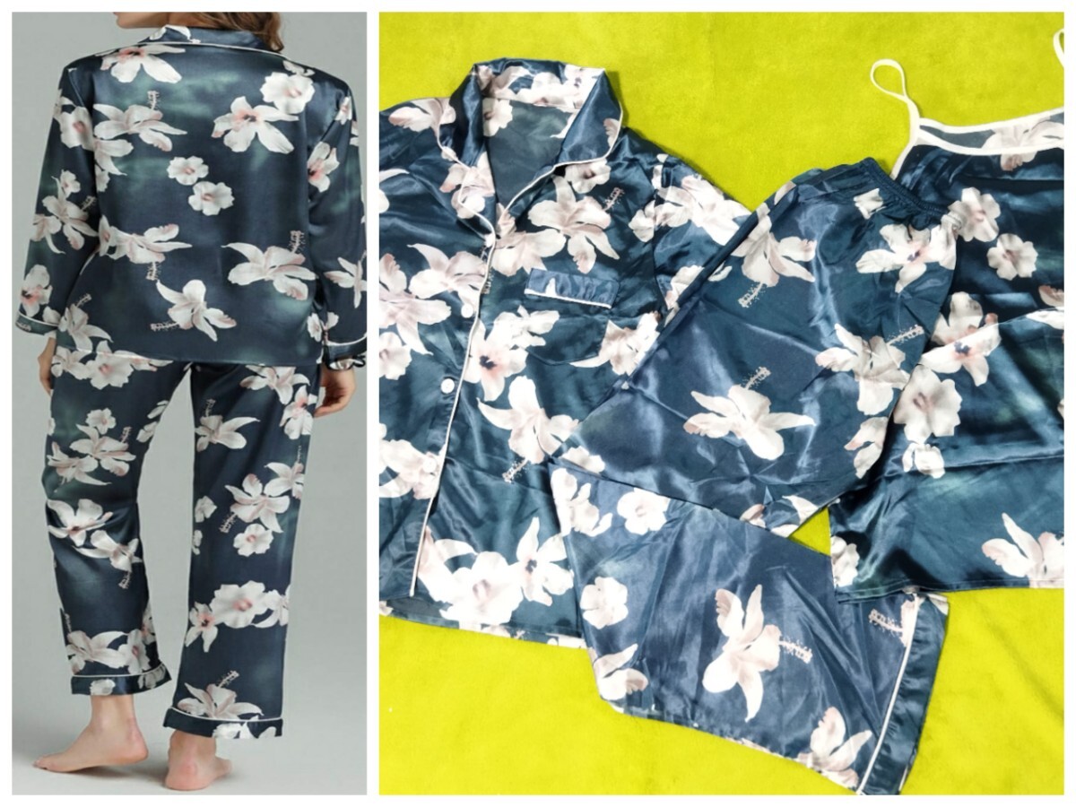 - 花柄 シルク風パジャマ (XL) 3点セット