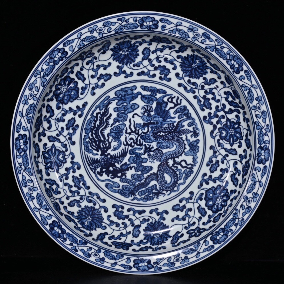 - ▽鴻▽ 清 乾隆年製款 古陶瓷品 青花 纏枝蓮龍鳳紋 供盤 陶藝 古賞物 古董品 時代物 稀少珍品 中国古玩 中国古美術