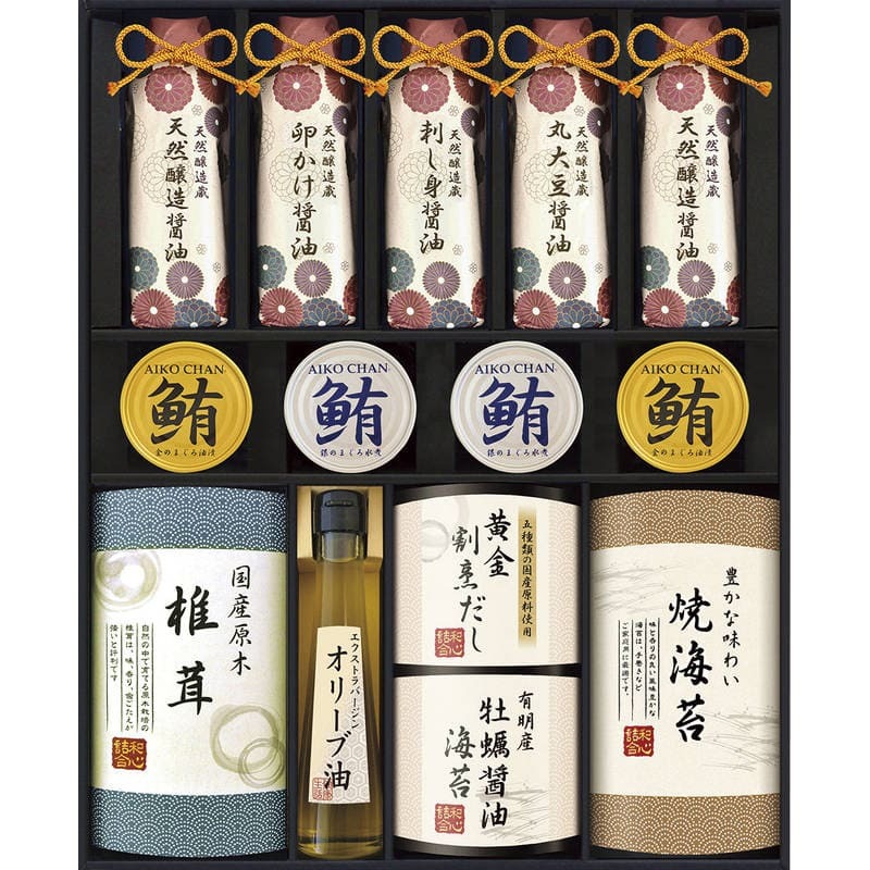 ▼▼▼▼▼▼注意事項▼▼▼▼▼▼・送料込み(送料800円が商品価格に含まれています) 一部地域では追加送料あり。・お取り寄せ商品です。弊社にて手配後、メーカー・卸業者からの直送になります。・まれにメーカー欠品、出荷遅延等が発生致します。問題発生時は別途メールにてご連絡致します。・配送方法の指定、日時指定、置き配、ギフト対応、他商品との同梱配送などは対応できません。・まとめ買いや複数購入の場合は通常より発送に時間が掛かる場合がございます・複数個口の場合、2階以上への搬入ができない場合があります。(その場合は1階での受け渡しとなります)・大型連休、お盆、年末年始などは発送をお休みさせていただく場合がございます・メーカー都合により、パッケージは予告なく変更される場合がございます・梱包用のダンボールはリサイクル品を使用させていただきます。・注文に関するご連絡(注文確定通知・発送通知など)はメールでご案内させていただきます※商品ページの内容について、少しでもご不明な点などがございましたら購入前に一度ご連絡ください▲▲▲▲▲▲注意事項▲▲▲▲▲▲〇商品説明老舗醤油蔵の天然醸造製法でつくられた卓上サイズのお醤油と、黄金割烹だしや牡蠣醤油海苔などを詰め合わせていました。どなたにも喜ばれる和食ギフトです。〇商品仕様【パッケージサイズ】410×60×470mm【内容】天然醸造醤油200mL×2、卵かけ醤油200mL・刺し身醤油200mL・丸大豆醤油200mL、有明海産 牡蠣醤油海苔(8切8枚)、焼き海苔(全型3枚入)、黄金割烹だしパック8g×4P、国産原木椎茸25g・エクストラバージンオリーブオイル100g×各1、金のまぐろ油漬け70g・銀のまぐろ水煮70g×各2 【アレルゲン】小麦・えび【生産国】日本、スペイン【パッケージ形態】化粧箱入【保存方法】常温【賞味期限】製造日より約450日(出典:CALM(カーム))