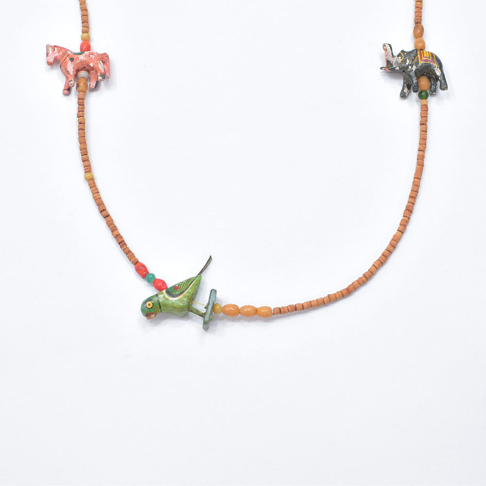 > Used エスニックデザイン アニマルモチーフ ウッドビーズ ネックレス フォークアート 民族調 象 馬 鳥 ハンドクラフト ヴィ
