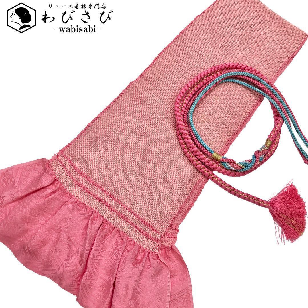 桃色ベースの総絞りの帯揚げに可愛らしい飾り付の帯締めが素敵なお品でございます。