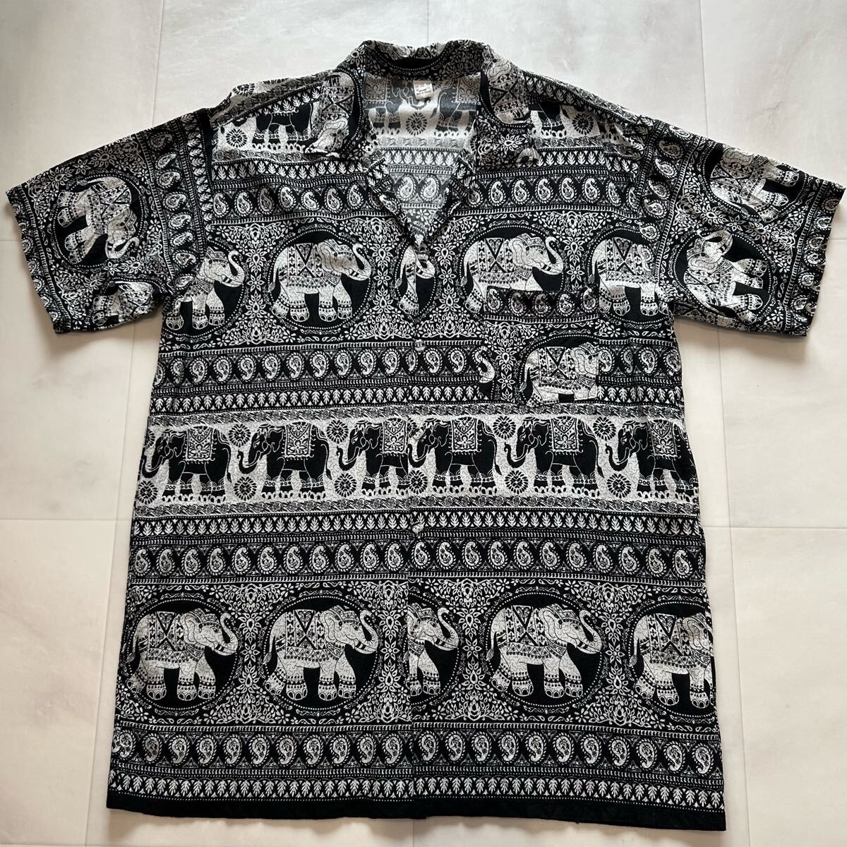 - 総柄 柄シャツ 開襟 オープンカラー 民族柄 ゾウ レトロ アート 半袖シャツ レーヨン100%