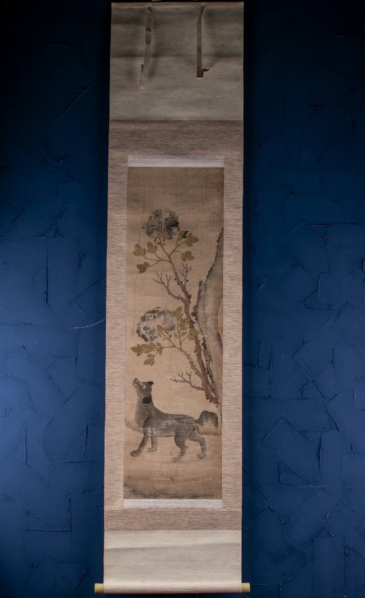 - 【絵画】 李朝民画 絹本肉筆 犬牡丹図 19世紀 軸装 E2057J 朝鮮古美術 朝鮮民画 リビング インテリア アート