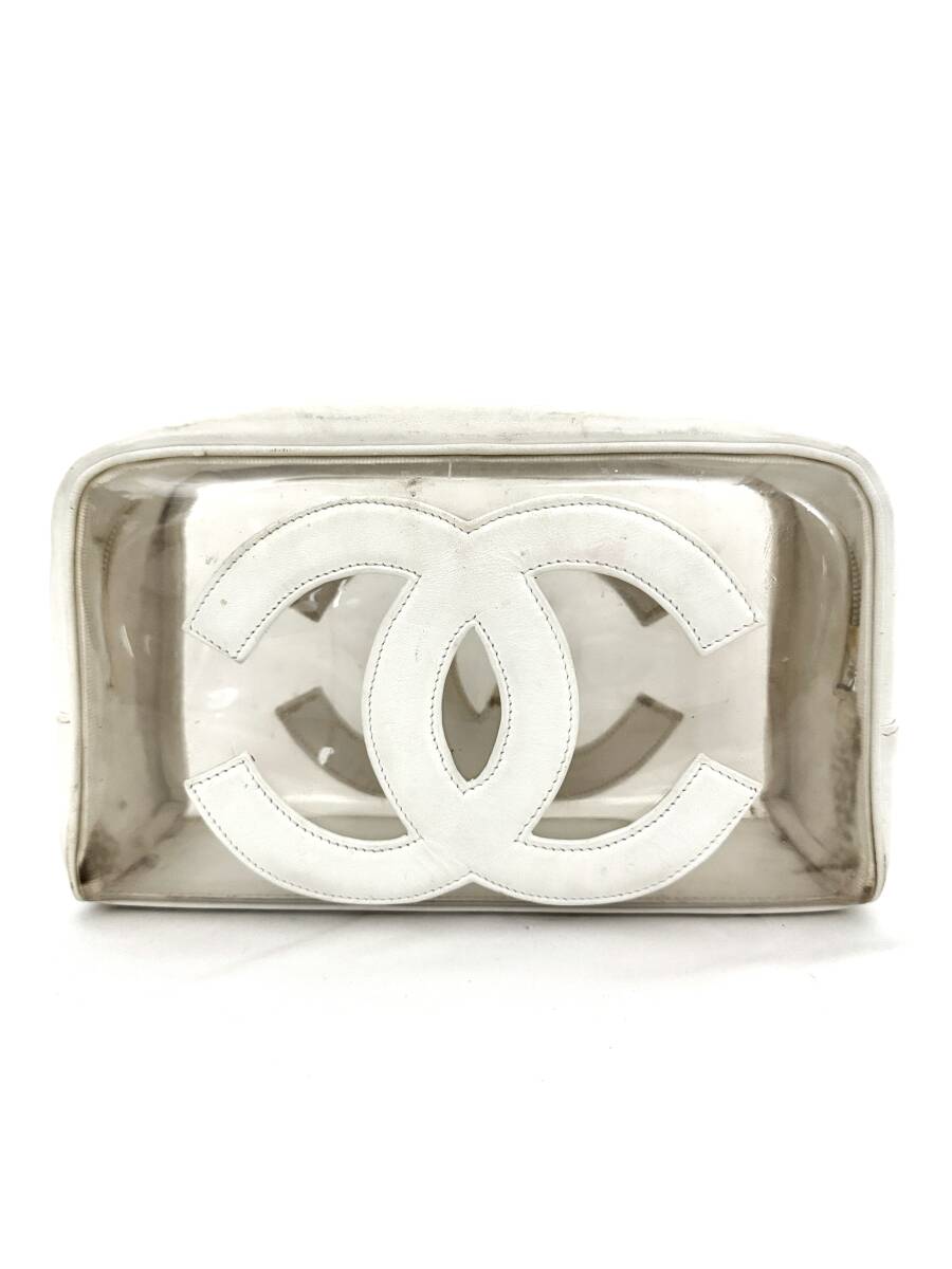 - 7H0304【本物保証】シャネル クラッチ バッグ バニティ コスメ 化粧 ポーチ レザー ホワイト ビニール CHANEL