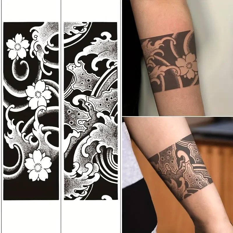 - 【タトゥーシール】★お得な2枚セット!桜 さくら / 波 腕 和柄 耐久性あり 約 8cm×22cm リアル 和彫 (HL-012+013) TATOO