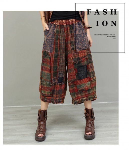 - gl 2508 ズボン 豪華刺し子 バッチ 綿&麻 洋服ミックス アンティーク風 ロマンファッション 縫い合わせ チェック柄