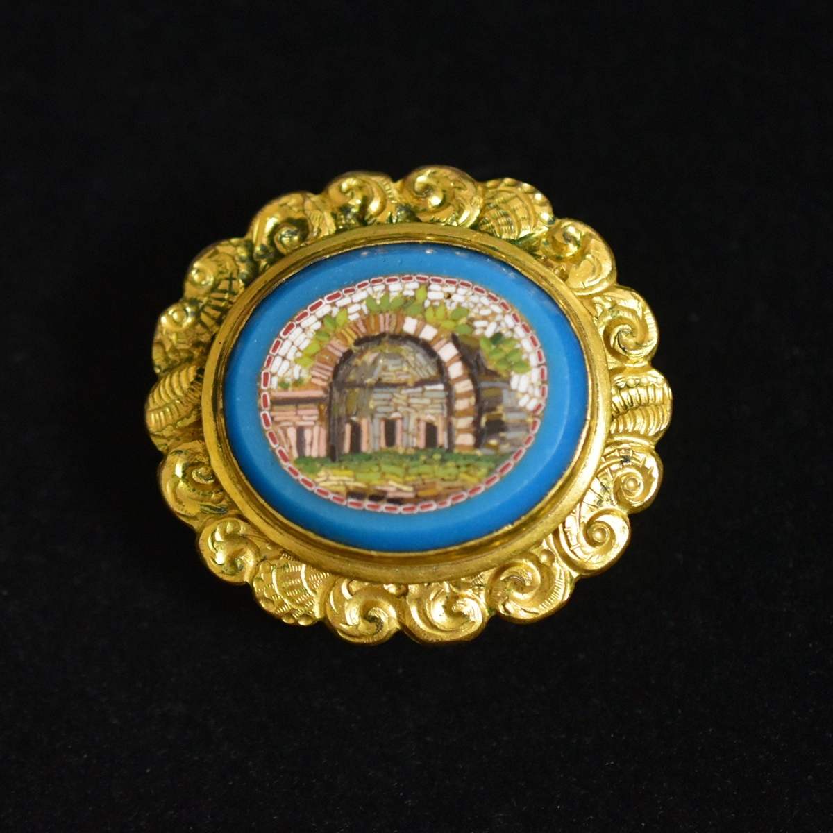 - ジョージアン アンティーク イタリア製 マイクロモザイクと金細工のブローチ イタリアの古跡 グランドツアー 本物保証