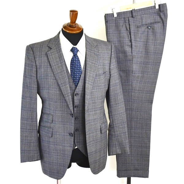 ・春夏秋対応。ベスト付き。2つボタンシングル。袖口4つ釦開き見せ。背抜き。センターベント。チェンジポケット。フラップポケット。ネーム刺繍あり(素材表記タグにもネームの印字あり)。
