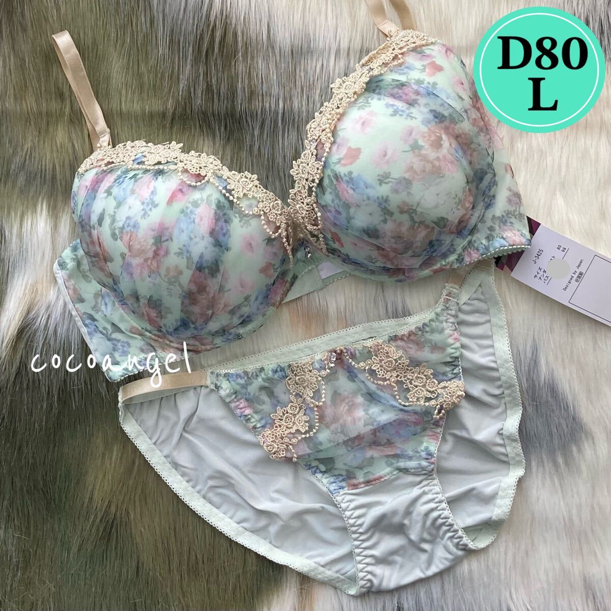 > 【D80-L グリーン 上下】新品 ブラ&ショーツ ブラジャーショーツセット パッド付き かわいいパンティ 花柄チュールプリント バラ Dカップ