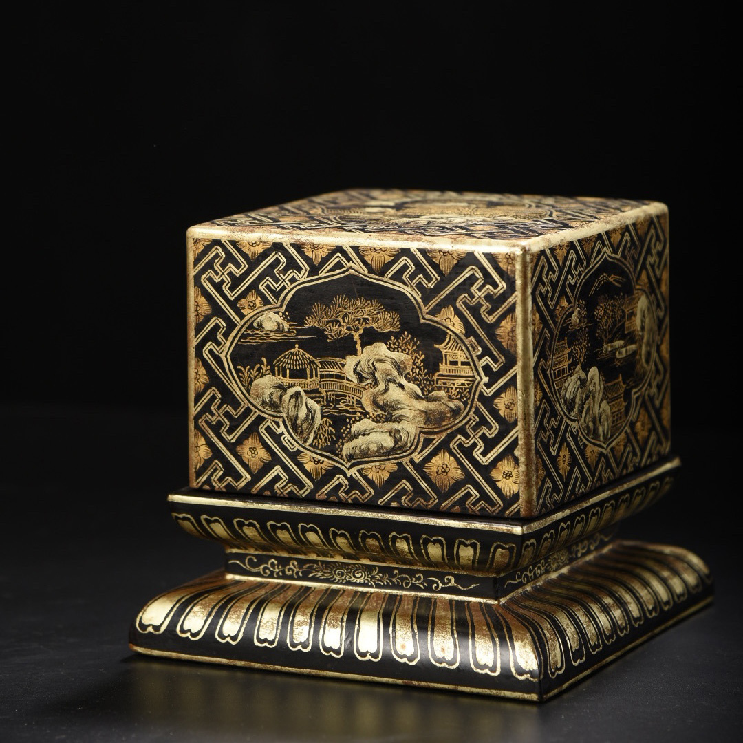 - 8+GV5964「東洋美術」 人間国宝 中国骨董 木製 工芸品 木彫り 時代物 賞物 【本金山水文様木地漆塗印箱】 書道具 文房具 収蔵価値が高い