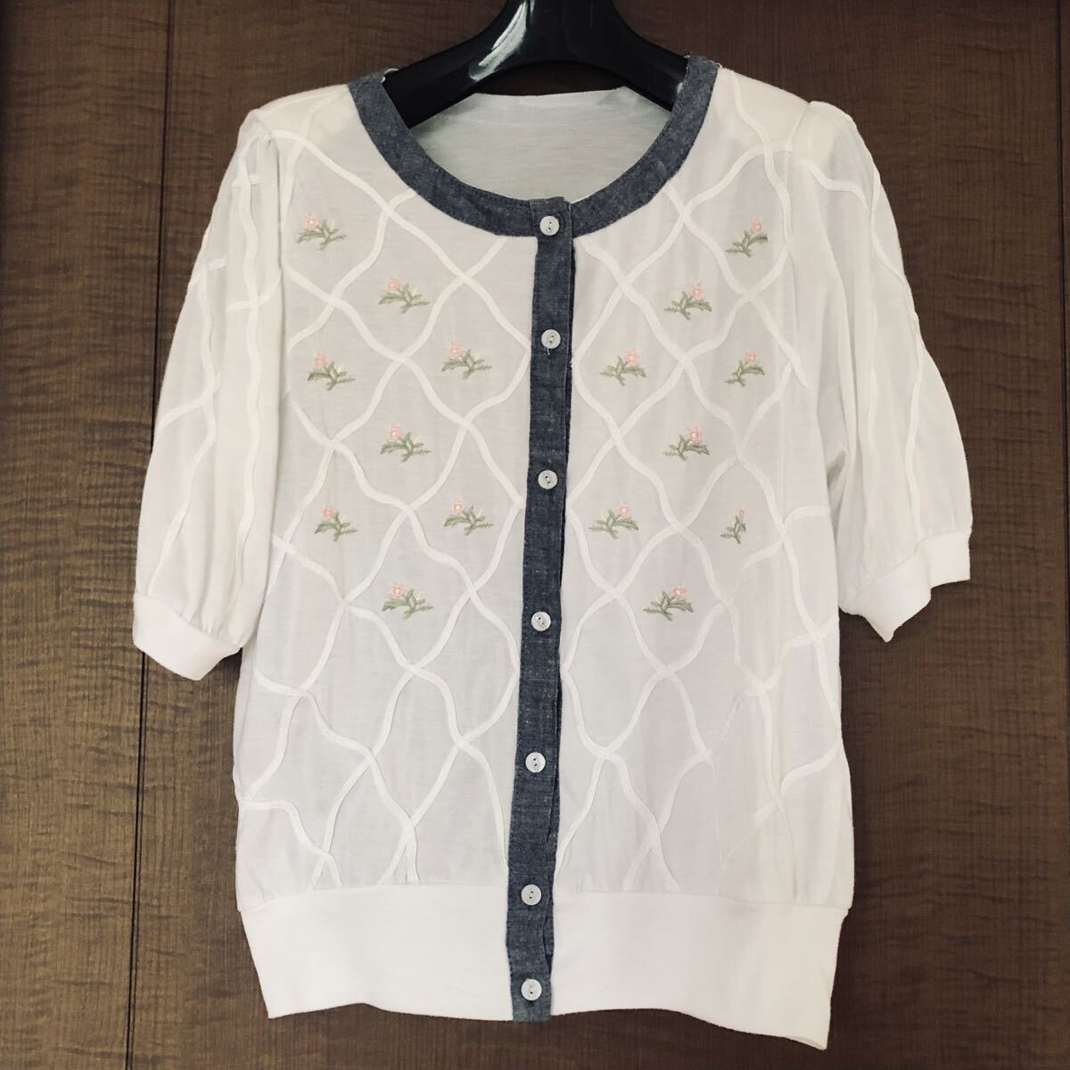 - Fサイズ表示 Mサイズ程度 花柄刺繍 前開きシャツ カーディガン ホワイト 春夏