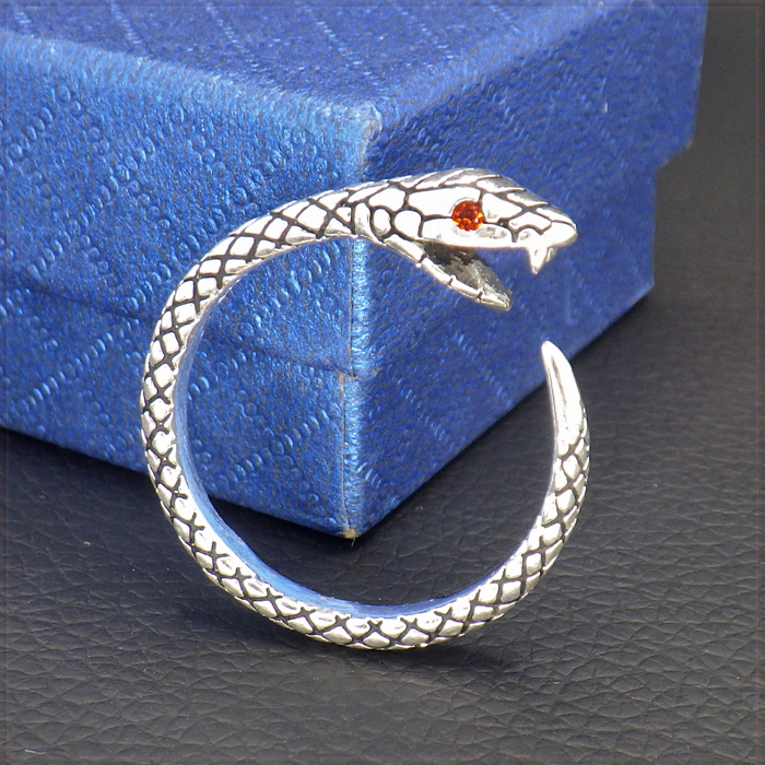 - [RING] 925 Silver Plated レッド アイ スネーク 赤目蛇 ヘビ 墨入れ ヴィンテージ シルバー オープン フリーサイズ リング 【送料無料】