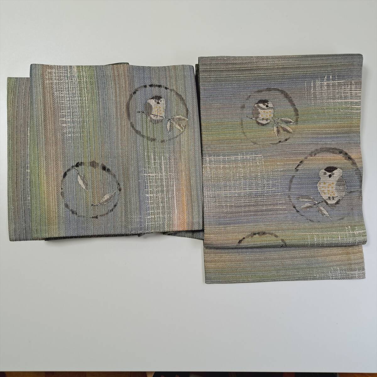 - 即決■着物の越田■幅31長さ467.5 正絹 袋帯 洒落袋 長尺 キラキラ 長さたっぷり フクロウ かわいい お太鼓柄 金糸あり ■み11J08