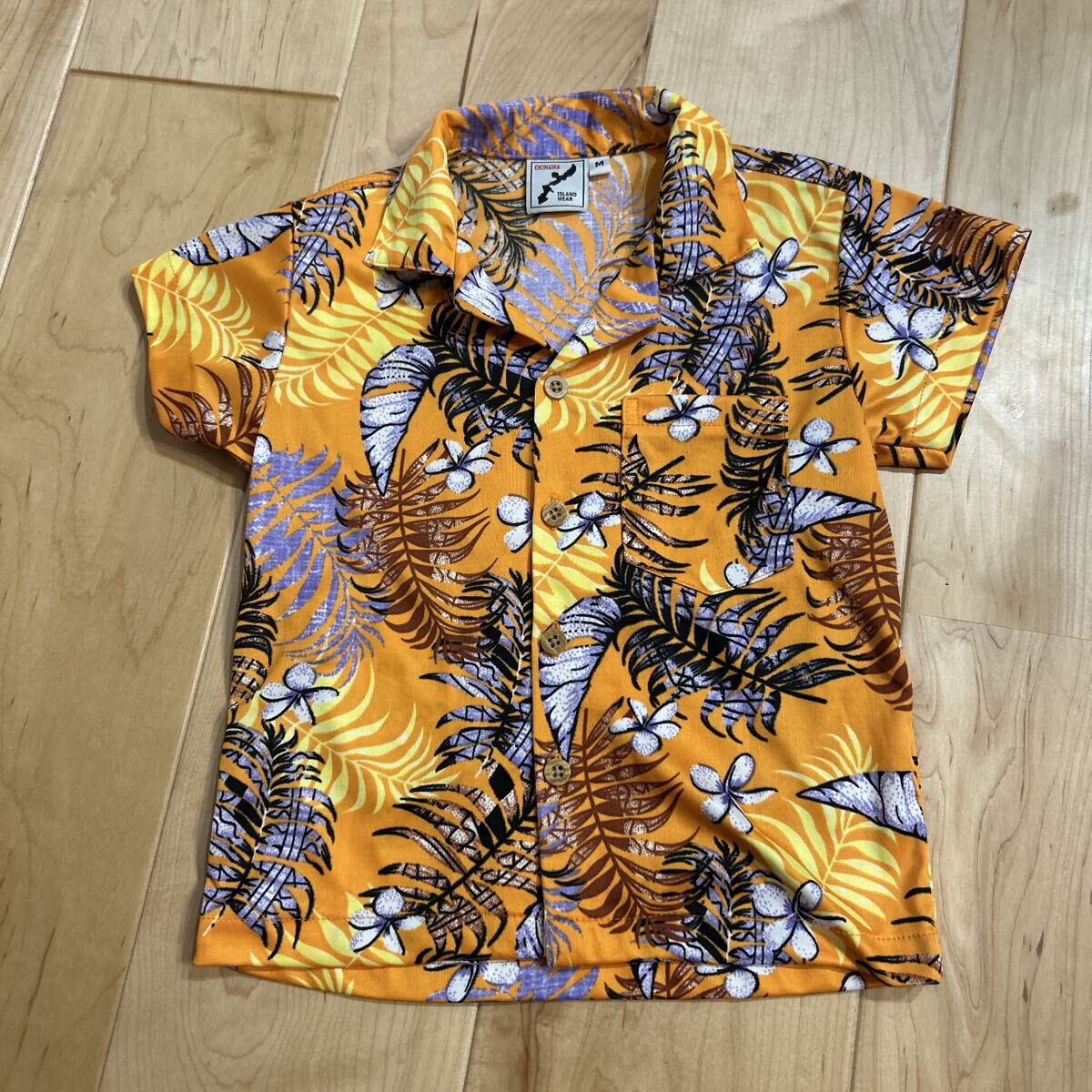 > 子供 90-100 アロハシャツ 沖縄 半袖 ハワイアン シャツ 総柄 M 黄色 南国植物