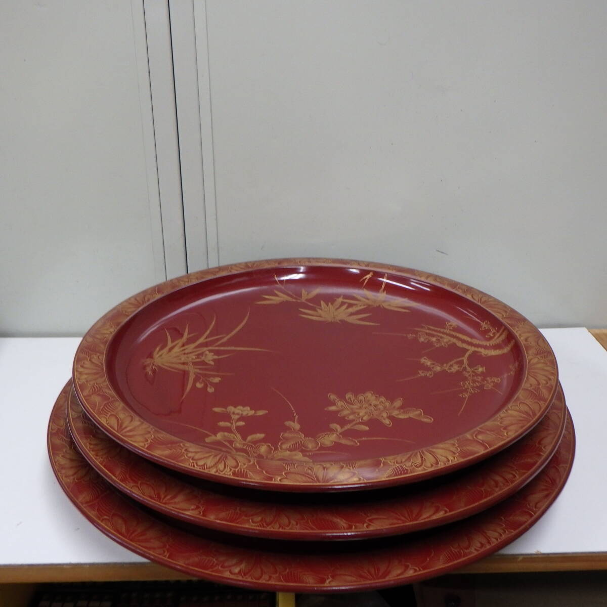 - 昭和 レトロ 輪島塗? 金彩 木皿 三枚組 梅 蘭 竹 菊 四君子 縁起模様 朱塗り 漆器 三枚揃え 沈金三つ組 大皿 丸盆 懐石料理 同梱不可