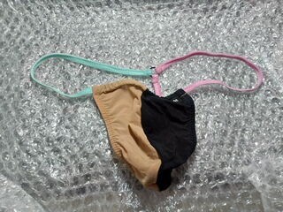 - TMコレクション、メンズビキニ、フロントポーチ黒・薄茶フルシーム、サイドストリング虹色、Tバック、M(76~84)サイズ、