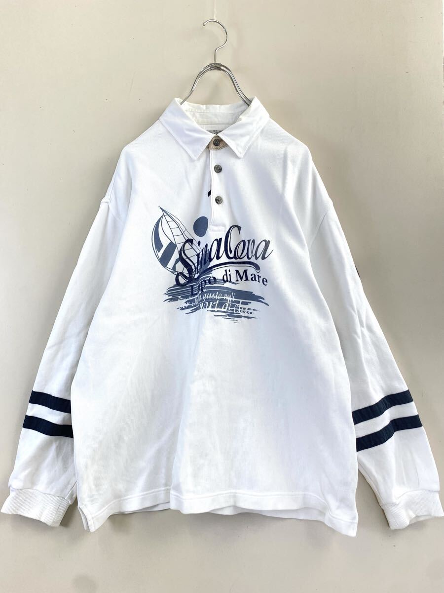- ★ キングサイズ SINA COVA 長袖 ポロシャツ 白 ◆ ヨットプリント ラガーシャツ 大きい カットソー シナコバ ◆W5 Gや0BI-05