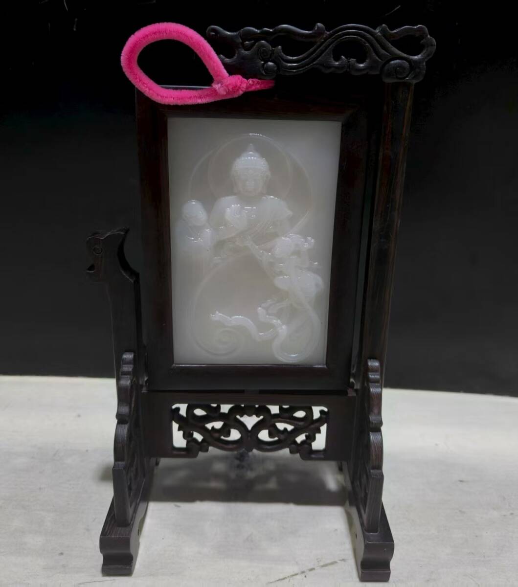 - 秘蔵 古木彫り 清代 古烏木に白玉を施した人物屏風【敦煌石窟仏教・唐・釈迦摩尼仏像 時代物 中国古美術 置物 賞物 唐物 文玩 8.14