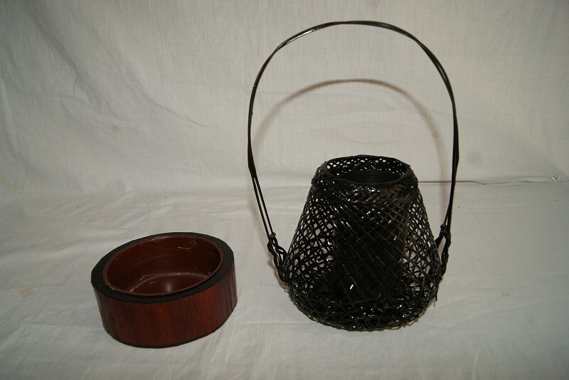 - A816★花入れ籠黒竹手元付・高さ24cm・竹製ミニ水盤落とし付サイズ深さ4.5cm×口幅11cm-12cm*まとめて2点
