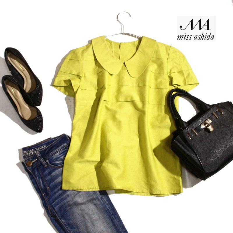 > 美品 miss ashida. ミス アシダ 夏 飾り ボーダー ピンタック きれい色 襟 綿100% デザイン 半袖 カットソー バックボタン イエロー M