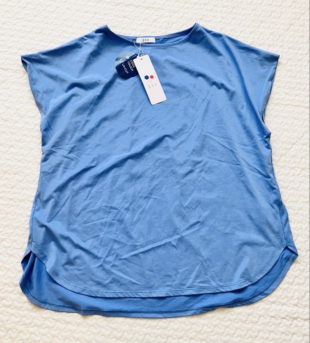 - 新品未使用タグ付★a.v.v アーヴェヴェ★接触冷感 UVカットカットソー M ブルー 水色 ショルダータックチュニックトップス 半袖 avv
