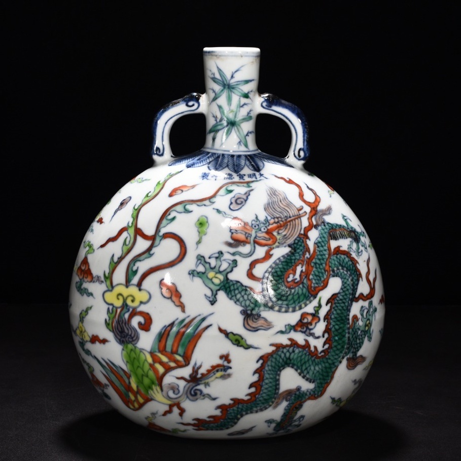 - 明時代 宣徳年製 青花五彩竜鳳紋 抱月扁瓶 高さ30 cm 幅23.5 cm 中国骨董 珍品旧蔵 古賞物 時代物 818