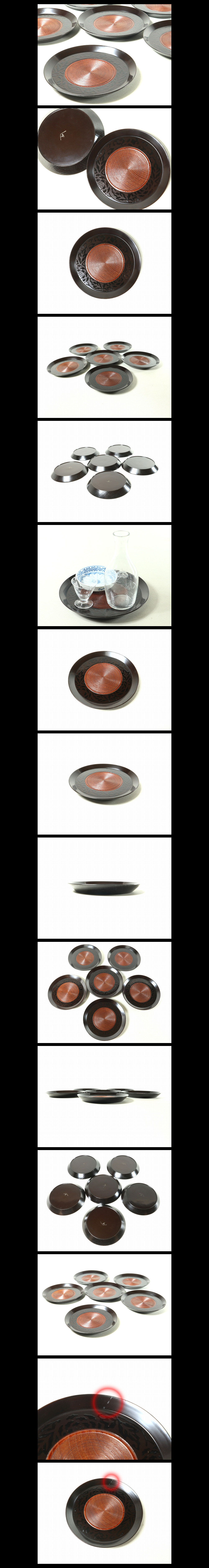 ●c4029●【黒蒔絵銘々盆6客 牡丹唐草 黒真塗溜地木目千筋 酒器盆煎茶盆菓子盆】検煎茶道具銘々皿菓子皿小振丸盆木皿闇蒔絵●西瓜●