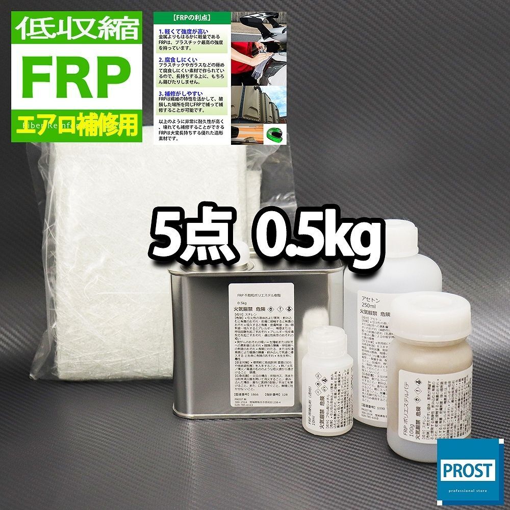 - 低収縮タイプ FRPエアロ補修5点キット 樹脂0.5kg 一般積層用 インパラフィン 硬化剤 ガラスマット アセトン パテ付き セット Z25